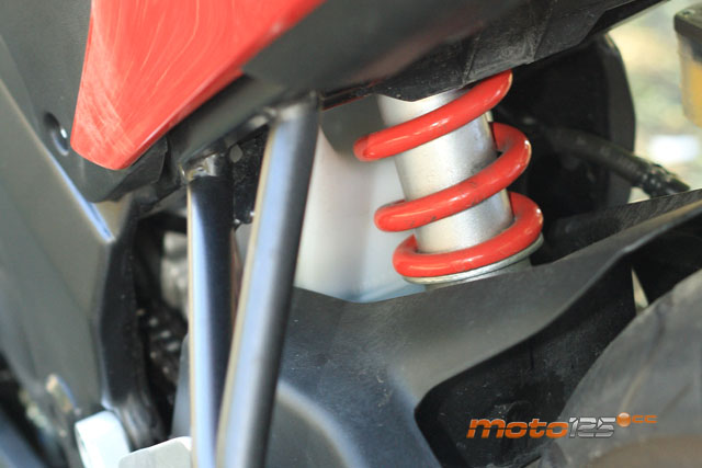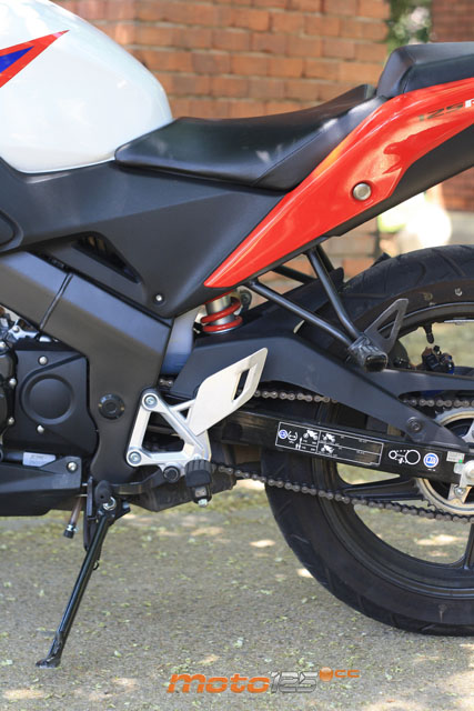 En este sentido, el mercado ofrece una gran variedad de modelos y precios con los que además se baten récords en velocidad máxima (más de 120 km/h reales) sacando, pues, todo el jugo a sus 125 cc. Las marcas europeas –con mucha participación española– (Aprilia RS4, Derbi GPR, Motorhispania RX y Rieju RS3) se decantan por ofrecer motos “grandes” apurando el límite de los 15 CV permitidos. En ese tacto de moto grande, no solo contribuye un bastidor sofisticado con grandes dimensiones (algunos incluso construidos en fundición de aluminio) sino también horquillas invertidas con barras de sección superior a los 40 mm, o monoamortiguadores posteriores dotados de progresividad variable (por bieletas), aparte de unos frenos más que sobredimensionados. Si tienes un rato, compara la ficha técnica de un supersport de 600 cc con una de esas mencionadas 125 y te quedarás de piedra: las mismas medidas de barras de horquilla, frenos y neumáticos. Está claro, que un ciclo de 600 cc da muy buenas sensaciones y a la vez contribuye a dar empaque y presencia a la hora de “vestir” con una deportiva de convalidación, en la que la cifra de “125” hay que buscarla con lupa.