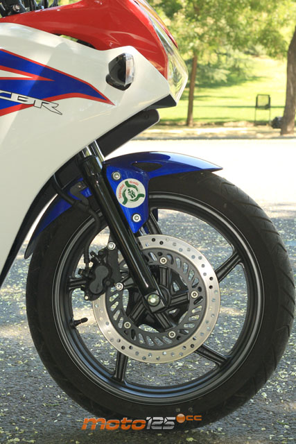 En esa línea también están los frenos: un disco delantero de 276 mm y el trasero de 220 mm. Contrariamente a lo que siempre ensalzamos de utilizar latiguillos de trenzado metálico, la CBR recurre a unos aparentemente vulgares latiguillos de goma, aunque de buena factura, como hemos podido comprobar poniéndolos al límite y verificando que no se hinchan. Eso sí, la calidad también se deja ver en la elección de unas pinzas firmadas por Nissin de doble pistón en el tren delantero y simple en el posterior. Esta claro que, a veces, lo sencillo es lo más efectivo, tanto en comportamiento como en el precio. La ligereza de la CBR la iguala casi a su competencia dándole una excelente agilidad en conducción urbana, y tanta sencillez repercute también en un precio más asequible. Imagínate de lo que sería capaz de conseguir la CBR apurando la potencia del motor.