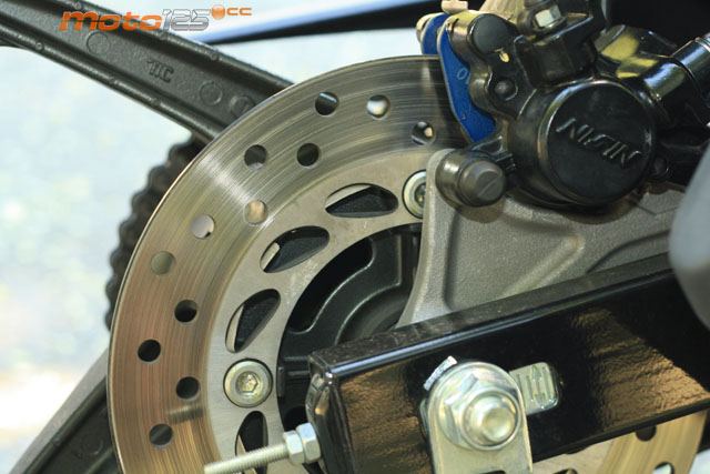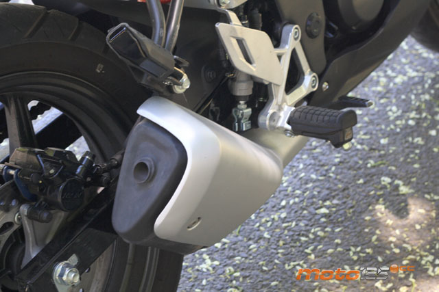 El escape sigue la tendencia de la moda actual de los últimos modelos de Honda (VFR 1200 y CBR 600 F): corto, muy panzudo (aunque en la 125 es por apariencia del protector) y con salida elevada hacia arriba. | El freno de disco posterior de 220 mm emplea una más que efectiva –y sencilla– pinza Nissin de simple pistón. Incluso, Honda recurre a latiguillos de goma en lugar de los de trenzado metálico. | Semiescondido por las faldas laterales del carenado encontramos el motor, aparentemente idéntico a la versión precedente. Pese a que no se luce tecnológicamente (2 válvulas y 13,3 CV) al final consigue poner en aprieto a otras deportivas. |