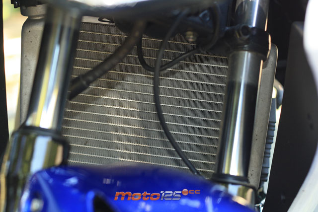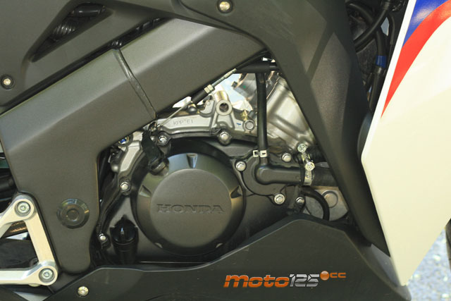 El motor rompe esquemas. Respecto de la anterior CBR se ha mantenido sin cambios importantes: algún retoque en el mapa de inyección y poco más. Su culata es de dos simples válvulas y rinde 13,3 CV. Sobre el papel, parece que está en inferioridad de condiciones para combatir contra el frente europeo equipado con propulsores de 4 válvulas (e incluso con doble árbol de levas DOHC en Aprilia y Derbi) que apuran el límite de potencia permitido -casi dos “jacos” más que la Honda-. Podrás pensar que todo esto responde a que Honda ha dado como prioridad la fiabilidad de la mecánica, pero desconcierta encontrarse con que su monocilíndrico refrigerado por agua sea capaz de girar hasta las 11.500 rpm que le permite el corte de encendido, muy por encima del techo aceptado en sus rivales.