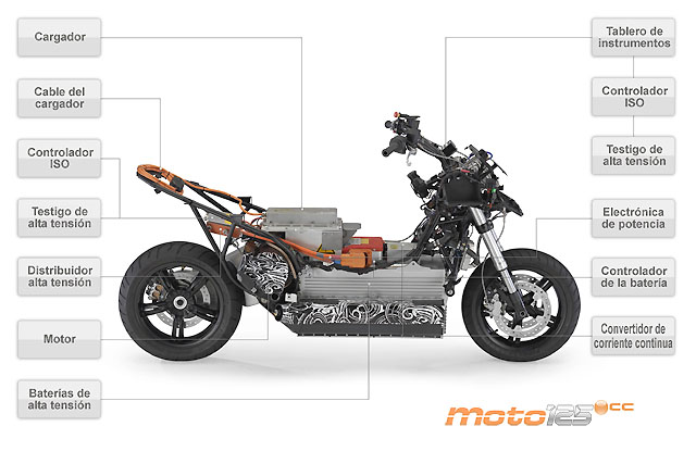 La suspensión trasera es por basculante monobrazo que transmite su oscilación a un monoamortiguador tipo cantilever que se sitúa en posición horizontal por el lado izquierdo. El basculante hace de cárter para encerrar y engrasar una transmisión secundaria por cadena. | La electrónica se apoya en la parte posterior superior de la estructura de las baterías, justo debajo del asiento del conductor. Detrás, la subestructura posterior parece dar cabida a un casco integral y algo más debajo del asiento del pasajero. El cable naranja es el del cargador a la red. |