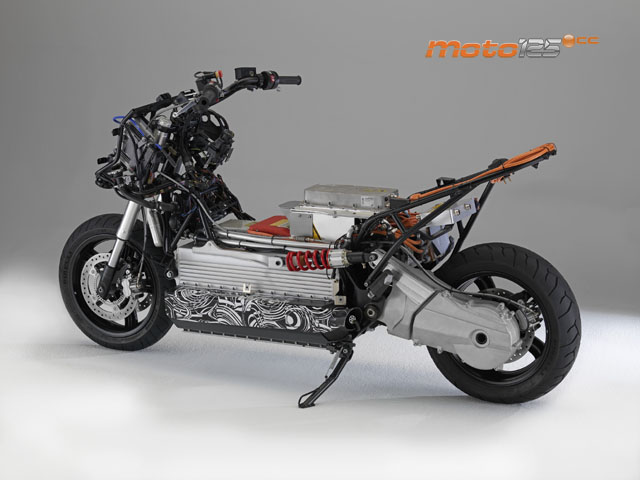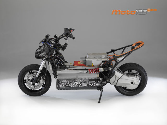 Más adelante, en el pasado Salón INTERMOT de Colonia, recuperaron el concepto C1 de scooter con cabina, pero adaptado a los nuevos tiempos con un bastidor ultraligero y motorización eléctrica con transmisión planetaria proporcionada por Vectrix. Y aunque se nos sale de nuestra “jurisdicción”, en el último Salón de Milán nos mostraron el Concept C: un megascooter impulsado por un motor bicilíndrico en línea que podría plantarle cara al Yamaha T-Max 500 en la temporada 2012, aunque, como ya hemos insinuado, no se podrá conducir con el carnet de coche debido a su elevada cilindrada.Con todos estos conceptos, está claro que BMW piensa dar un giro en su mentalidad, complementando la producción de motos de alta cilindrada con scooters, tanto con motor térmico como eléctrico. Y el nuevo BMW e-Scooter que os enseñamos en esta página confirma sus intenciones. Se trata de un scooter de grandes dimensiones con diseño de scooter GT, que ofrece a su conductor un puesto de conducción amplio y cómodo, con una excelente protección de escudo y parabrisas. La curiosa decoración del prototipo que se muestra en las fotografías y vídeo solo pretende “despistar” confundiendo las formas y diseño de su carrocería.Se insiste en que se trata de un Concept (prototipo para experimentar conceptos), pero la matriculación de esta unidad, así como los excelentes acabados que muestra, dan a entender que podría pasar a la producción muy a corto plazo. Por lo que nos cuenta BMW, el e-Scooter promete mucho. En cuanto a autonomía, y a la vista de las fotografías, va sobrado en baterías, declarando una autonomía práctica de 100 km, una distancia más que suficiente para el uso normal al que se le da a los scooters con motores térmicos convencionales; además, BMW asegura que el tiempo de recarga cuando las baterías están a 0 es inferior a las tres horas conectando el cargador integrado a cualquier enchufe de la red eléctrica doméstica. Pero eso no lo es todo, el motor eléctrico que lo impulsa declara una aceleración de 0 a 60 km/h comparable a la que registran los actuales megascooters con cilindrada de ¡600 cc!