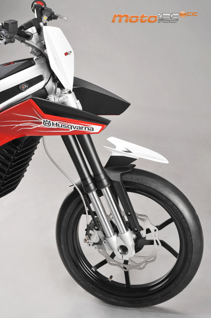 El diseño de esta Husqvarna no puede ser más futurístico: no cabe duda de que en los concepts mandan los diseñadores y nadie impide que su imaginación vuele libremente. Fíjate, por ejemplo, en su suspensión delantera que sujeta el conjunto de la rueda por el lado derecho empleando un par de horquillas invertidas para evitar la torsión, el diseño del basculante de aluminio –también monobrazo- que se bifurca en dos y se vuelve a unir o el espectacular largo asiento en voladizo que forma parte de la estructura del bastidor. Como se puede apreciar, a pesar de ser una moto eléctrica, de corriente no tiene nada (se me había puesto tan a tiro el chiste, que ha sido irresistible, lo siento). Es más, entran unas ganas locas de probar la eficacia de tanto recurso técnico de última hornada y la adaptación al off-road con un propulsor eléctrico.