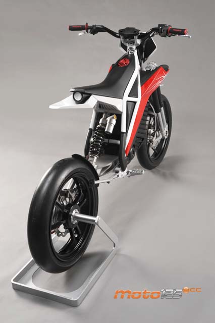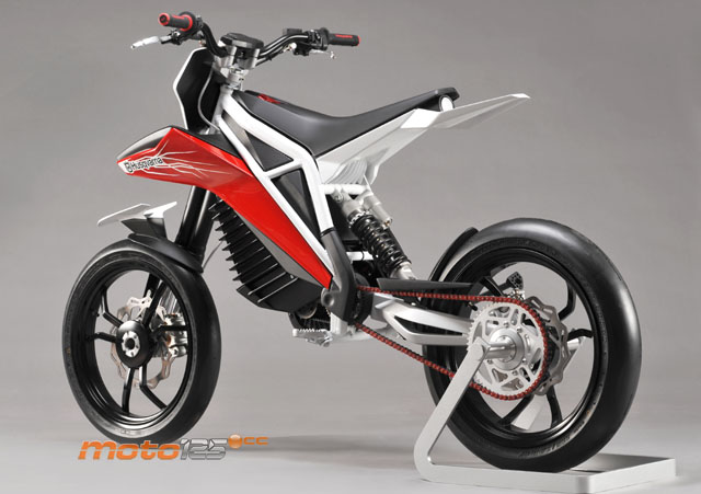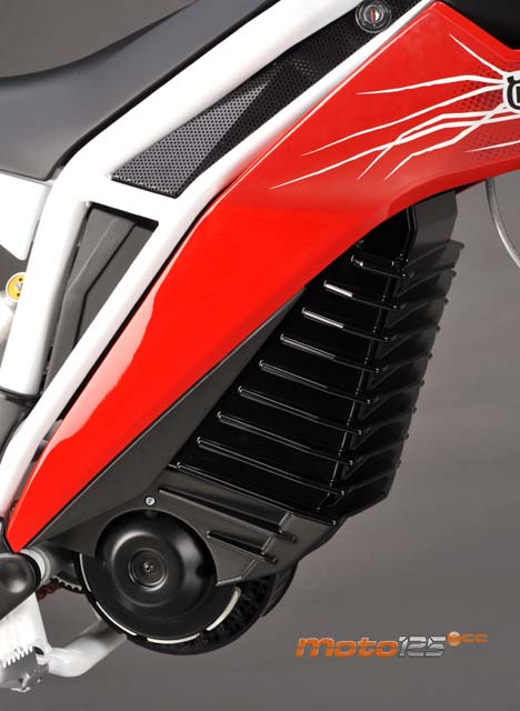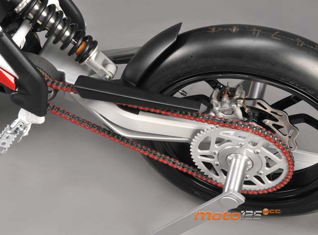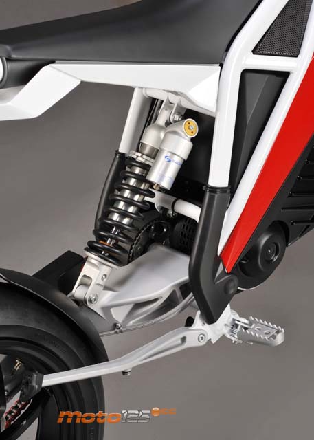 La mayor originalidad reside en el tren delantero, ya que está compuesto por dos horquillas invertidas con barras de 35 mm por el lado derecho. A nivel de peso, el sobredimensionamiento de las tijas y del soporte de la rueda no compensan, sobre todo en un vehículo eléctrico. | El motor es un Lynch muy similar al de la Quantya con potencia de 11 kW (15 CV) para permitir su utilización con el carnet de coche y con el A1 desde los 16 años. Por encima de él se sitúan las baterías que, presumiblemente, deberían ser de polímero litio (menor peso y volumen para la misma capacidad). |
