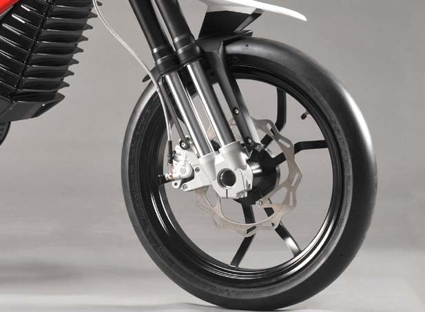 El concept viene calzado con unos neumáticos slicks (sin dibujo) radiales Dunlop en medidas 95/70-17 para el delantero y 115/70-17 para el trasero montados sobre llantas con seis palos quebrados, como con la intención de ofrecerse como supermotard eléctrica, aunque insistimos en que debería existir también una variante enduro recurriendo a ruedas de tacos con llantas de radios.