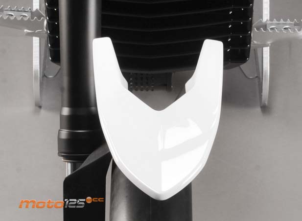 El amoriguador es un Sachs oleoneumático multirregulable en hidráulico y precarga, y con depósito de gas independiente. Se ancla directamente al basculante, sin bieletas para obtener progresividad variable. | Originalísimo el tren delantero. Rompe todos los esquemas conocidos, aunque habrá que comprobar si de verdad puede superar a una horquilla tradicional, sobre todo por rigidez y peso. El guardabarros delantero lo estropea todo: pelín hortera. |