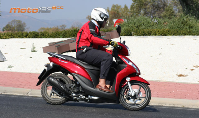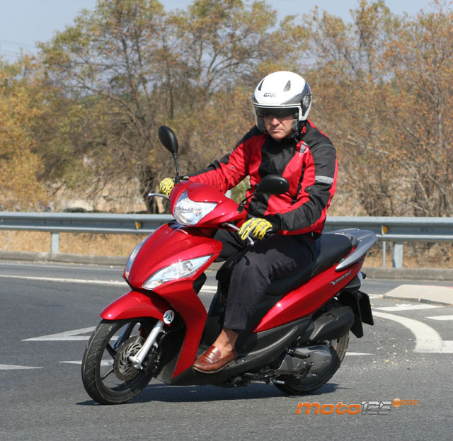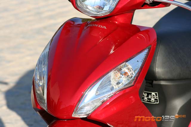 Pesa poco; con los 5,5 litros llenos de su depósito, nuestra báscula le da poco más de los 100 kilos (101,6 kg para ser exactos), y con la corta distancia entre ejes que te contábamos (1.255 mm, siguiendo con la precisión) le convierten en un vehículo muy ágil para los desplazamientos urbanos, sin el nerviosismo de la rueda pequeña. Sin duda, muy efectivo. Pero es que a ese brillante comportamiento del bastidor se le suma el motor. Acelera muy bien, se pone en los 80 km/h enseguida y, si le dejas explayarse en carretera abierta, verás los 105 km/h en su velocímetro, que son 96,8 km/h reales, según telemetría. ¿Desconcertado? Nosotros también lo estábamos. En principio, es casi inexplicable que con una desventaja de partida de 108 cc y 8,4 CV se puedan empatar los resultados de scooters de 125 cc reales y en torno a los 10-11 CV de potencia. Lo único que lo justificaría sería ese bajo peso y las ruedas de sección casi de bicicleta que te comentábamos al principio. Está claro que para Honda se está convirtiendo en una obsesión minimizar los rozamientos y, en ese sentido, es fundamental bajar el “lastre” del peso y contar con la mínima resistencia de rodadura, aunque el aspecto “visual”.