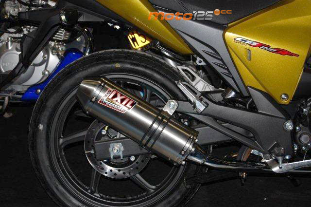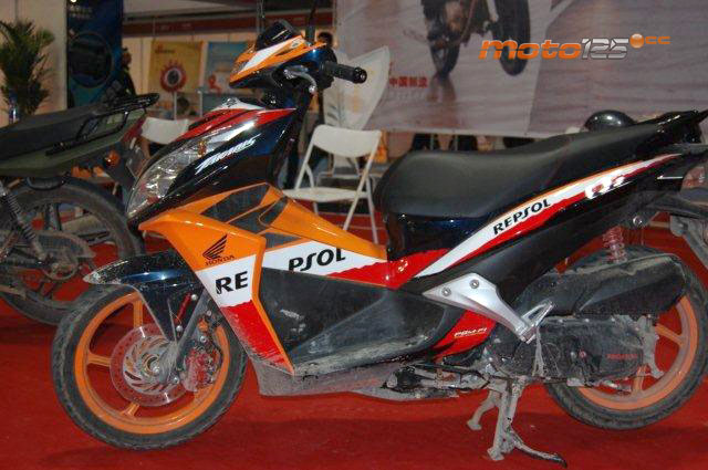 ¿Qué hace una marca como tú en un sitio como éste? La firma de escapes española Ixil también contaba con un stand en el Cimamotor. En la fotografía se ve el modelo dirigido para la CBF 150, similar al de nuestra CBF125 homologado para Europa. | Interesante nuevo concepto de Honda con los colores de guerra de Repsol. Tiene un poco de “rueda alta” asiático, pero en lugar de usar motor de marchas, dispone de uno automático del Vision 110. |