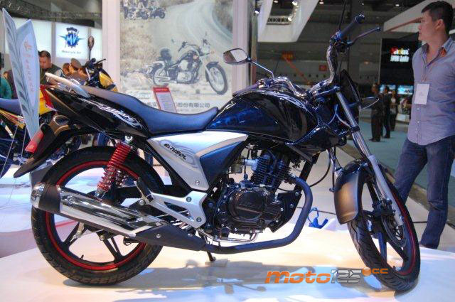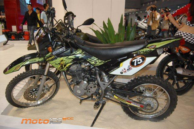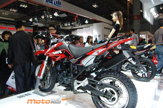 Nos sorprendió encontrarnos con una azafata no China en el stand de CFMoto sentada sobre esta deportiva de 125/150 cc. Nos contó que no era inglesa (a pesar del modelito que llevaba) sino rusa y en una marca China. Menuda combinación. | Shineray, la marca china que explota su liderazgo en el Campeonato Nacional de MotoCross, presentaba esta trail con las formas de la moto campeona, aunque impulsada con un motor más tranquilo y civilizado. |