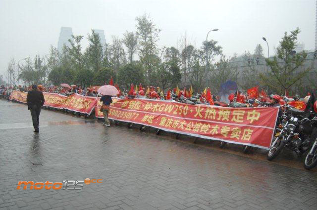 Chongqing es la región con mayor densidad de producción de motos y scooters del planeta. No es de extrañar que, la mayoría de las autoridades del país se vuelquen con su presencia en este Salón. | El clima es tropical y no paró de llover durante la ceremonia de apertura. Hay mucha afición por la moto y muchos Chongquinenses quisieron participar con sus monturas (tipo Yamaha YBR) en el desfile de inauguración. |
