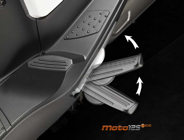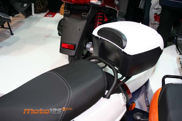 Delante de las piernas hay una guantera abierta para llevar a mano objetos pequeños. La cerradura de contacto dispone de obturador. | La unidad mostrada en Milán disponía de un baúl trasero para aumentar la capacidad de carga. Incluye un pequeño respaldo para el pasajero. |