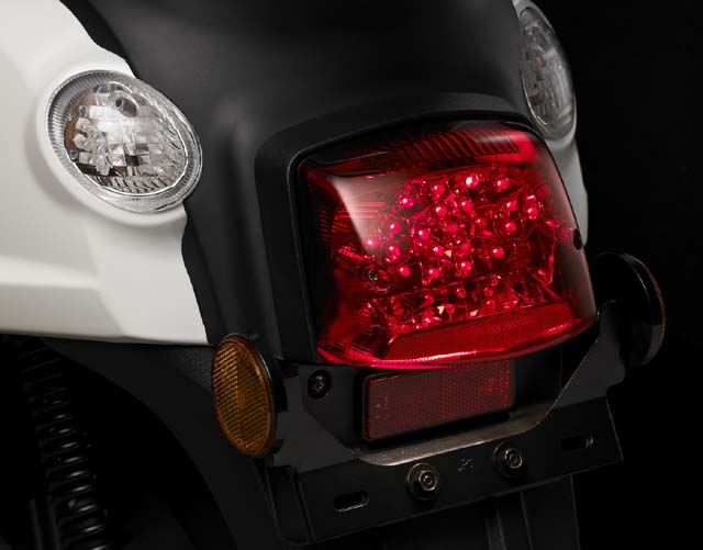 Sencillo pero completo tablero de instrumentos basado en una pantalla LCD. Muestra, en grandes dígitos, la velocidad, pero también el cuentakilómetros, hora, modo de funcionamiento y nivel de carga de la batería. También ofrece un autodiagnóstico mostrando el código de error si aparece cualquier avería. | De nuevo la iluminación por LEDs se emplea en la parte posterior, tanto para el piloto-luz de freno como para los intermitentes. Se trata de no consumir energía eléctrica. |