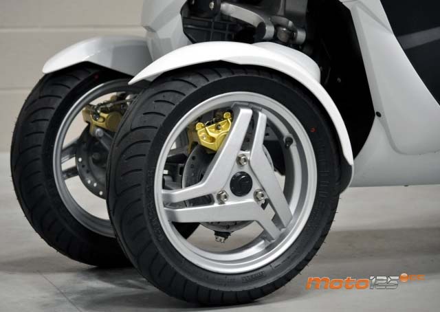 Lógicamente lo que cambia es el tren delantero, por paralelogramo deformable pero muy diferente al que conocemos del MP3 de Piaggio o el sistema hidráulico del nuevo Quadro. Cuenta con un sistema “e-lock” que bloquea a voluntad del conductor la inclinación de las ruedas delantera siempre que el vehículo no supere los 8 km/h, desactivándose automáticamente a mayor velocidad para conseguir la máxima movilidad.