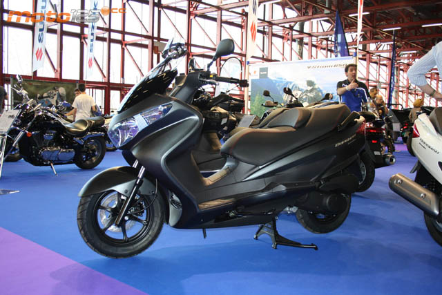 La pequeña custom Suzuki Marauder se mostraba en un color blanco integral y negro, ambas impulsadas por el monocilíndrico de la marca de cinco velocidades con alimentación por inyección electrónica. El superventas sigue siendo el Suzuki Burgman 125 que se sirve en múltiples variantes de colores y versiones; la que se puede ver en la fotografía del centro corresponde a la nueva versión Executive en color negro mate. Y para el motoexcursionismo qué mejor que la Suzuki Van Van con sus ruedas gordas, baja altura y dócil motor de inyección con cambio de seis velocidades.