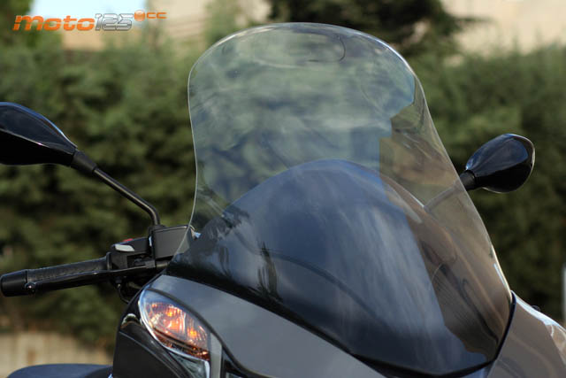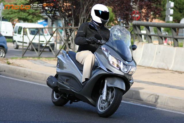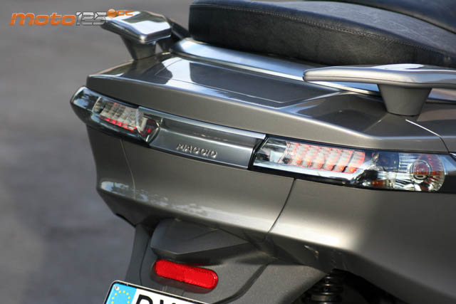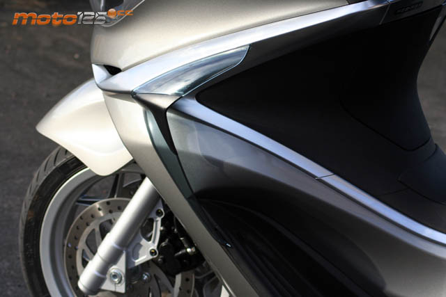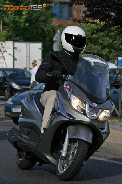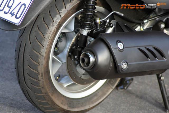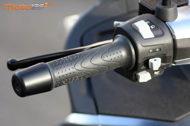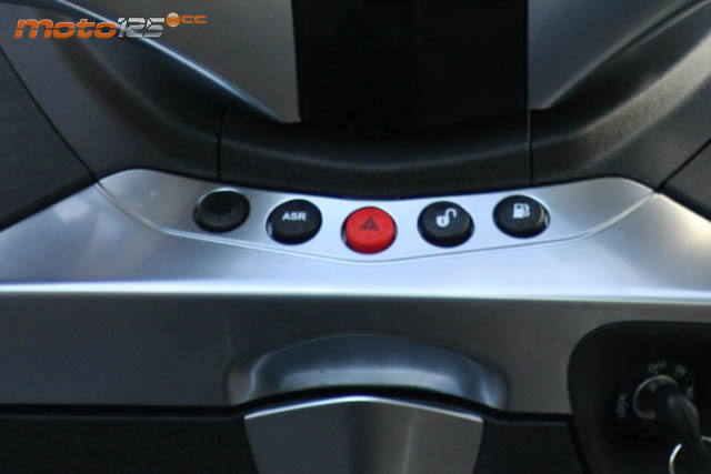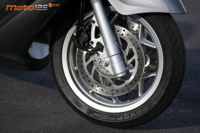 Pero hay más. A nivel de equipamiento encontramos en su tren delantero con rueda de 15 pulgadas un doble disco de 280 mm: todo un récord en los 125 y por partida doble. Uno de esos discos está accionado por la maneta derecha y el otro se combina con el posterior de 240 mm en la izquierda. Naturalmente, aunque ambos discos sean idénticos con pinzas de doble pistón flotantes también idénticas, la contribución del disco delantero combinado se ha suavizado con un repartidor de presión que lo deja al 30%. Se trata de darle una pequeña ayuda al trasero para los usuarios con poca experiencia; imagínate si el 100% de ese disco se une al posterior: ¡para salir disparado hacia delante en un frenazo! En la versión Executive que ha pasado por nuestras manos, se añade el sistema ABS y un control de tracción ASR: demasiado esto último para un 125.