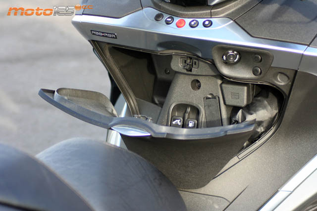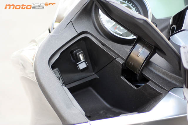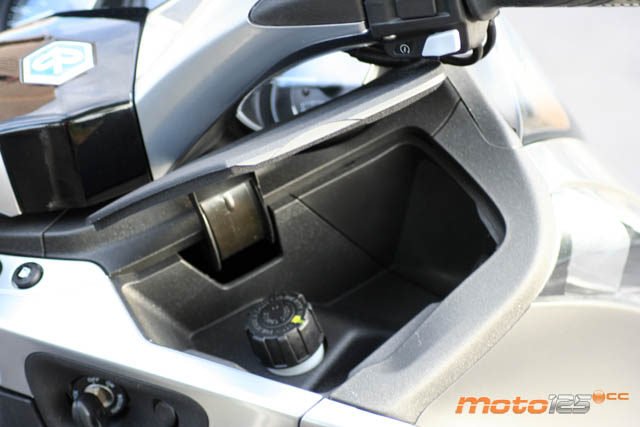 Otra de las virtudes en las que se luce el X10 es en capacidad de carga: el espacio bajo el asiento merece ser tratado con más dedicación en nuestro apartado “El detallazo”. La capacidad para dos cascos integrales y mucho más se complementa con una amplia guantera central que se abre presionando la llave de contacto y deja al descubierto una bolsa con el chubasquero para cubrir el asiento los días de lluvia, la caja de herramientas y una toma de corriente de 12 voltios tipo mechero. Esta guantera se complementa con otras dos más pequeñas en la base del manillar sin protección por cerradura. La de la derecha, en realidad es para acceder al tapón del vaso de expansión, aunque queda espacio para llevar a mano unas llaves o monedad; la de la izquierda tiene más capacidad e incluye una toma de corriente tipo USB para la última generación de teléfonos móviles.