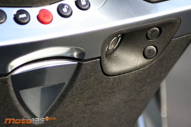 Y hay muchos detalles. Nos ha gustado, por ejemplo, que el casco de atrás se sitúe descentrado hacia la derecha de manera que deja a su izquierda más espacio para otros objetos. Dispone de iluminación, fondo de terciopelo para proteger el contenido, un hidráulico que lo mantiene abierto junto a la bisagra (muy discretro), dos tapas de goma en su parte posterior para cambiar bombillas fundidas de los intermitentes y un bolsillo para llevar la documentación.