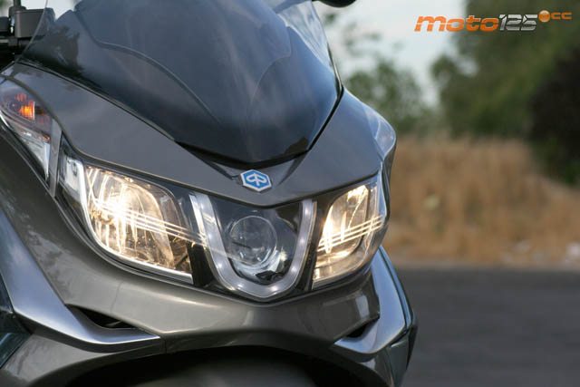 En cuanto al diseño, Piaggio estrena otro estilo diferente con el X10. Fuimos testigos de una cierta etapa de transición con los nuevos Beverly y el Yourban de tres ruedas, y a la vista está que el X10 rompe con los tradicionalismos de la marca. Sus formas laterales musculosas recuerdan a las del Yamaha Majesty 400 pero con un frontal muy personal marcado por una doble óptica para las luces cortas y una única óptica polielipsoidal para las largas con una hilera de LEDs blanco-azulados que envuelven a esta última. Pero no solo se ha buscado que el X10 sea atractivo; ese diseño ha sido probado en túnel de viento buscando la mejor penetración aerodinámica y la efectividad de su pantalla central.