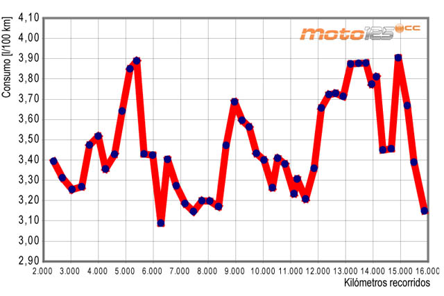 También te adelantamos en el primer capítulo que registramos los consumos desde los 2.000 primeros kilómetros. Aunque el uso fuese siempre mixto ciudad-carretera y piloto solo con ocasional pasajero, lo cierto es que los valores mínimos se registraban con una mayor contribución de uso en carretera, y los superiores en ciudad, El valor máximo fue de 3,90 l/100 km, mientras que el más bajo alcanzo los 3,09 l/100 km. El medio fue de 3,41 l/100 km que también se corresponde con los testimonios.