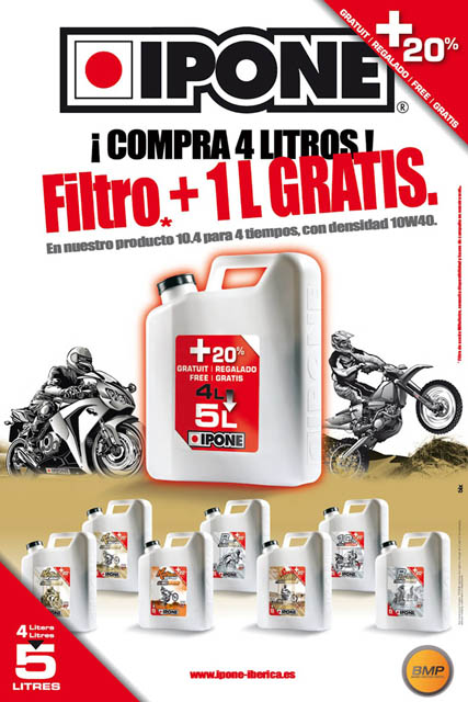 Para promocionar la entrada de la marca, han lanzado una campaña de promoción por la que con la compra de uno de sus productos estrella, el aceite para cuatro tiempos 10.4 Shyntesis (10W40), IPONE regala un litro extra de aceite y un filtro de aceite.