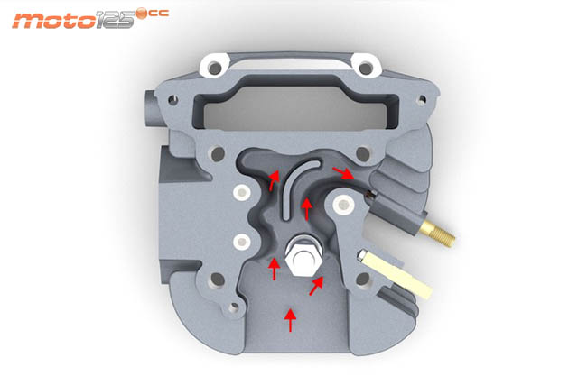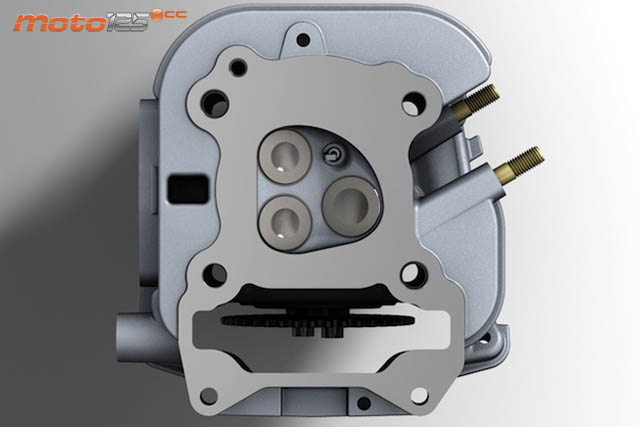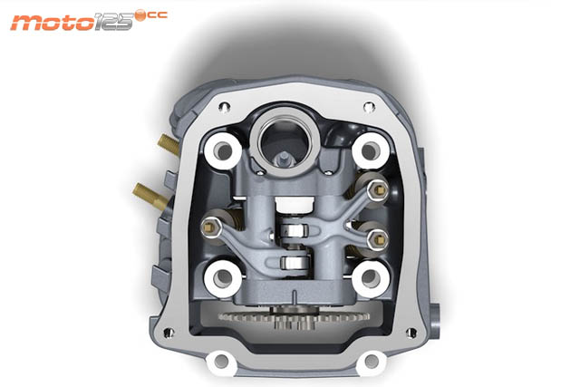 Comenzando por las cotas interiores del cilindro, sus 124,5 cc reales se obtienen con un diámetro de 52 mm y una carrera de 58,6 mm, que no tienen nada que ver con los 57 x 48,6 mm empleados en las mecánicas anteriores pasando de ser de carrera “corta” a “larga” lo que favorece el empuje desde bajas revoluciones y, por tanto, las aceleraciones. En la culata se encuentra más cambios importantes. Su distribución es de tres válvulas accionadas por un árbol de levas: dos válvulas de admisión de 20 mm de diámetro y una de escape de 22. Los balancines de admisión y escape (de 3 y 2 brazos respectivamente) contactan con las levas a través de rodillos cromados. El árbol de levas gira sobre rodamiento de bolas y está preparado para recibir un mecanismo descompresor que facilite la puesta en marcha, aunque no está implementado en este 125 cc. Se ha prestado especial atención a la refrigeración de la culata, consiguiendo que la circulación del aire roce directamente la bujía y el colector de escape.
