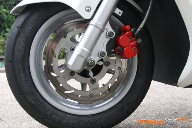 De hecho, como scooter ciudadano que es cuenta con suelo plano, ruedas de 12 pulgadas, guantera abierta tras el escudo y aspecto ligero. Pero lo mejor llega al haber combinado esta parte ciclo con un potente motor de casi 14 CV de potencia refrigerado por agua y con culata de 4 válvulas, que hasta el momento estaban reservados a los scooters GT o Rueda Alta.
