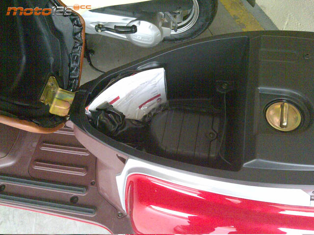 Contrastando con ese tamaño, el Zahara cuenta con un asiento generoso en amplitud y mullido para dar cabida holgadamente a dos plazas. Está tapizado en símil piel y esconde un hueco de casco muy profundo. El asiento se abre desde la cerradura de contacto que además incorpora un obturador para impedir la manipulación interior.