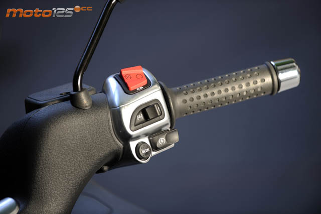 La llave de contacto incluye un botón para abrir a distancia el asiento delantero. También incluye codificación electrónica: aunque copies la llave físicamente y puedas desbloquear la dirección, el encendido no funcionará y el MP3 no se podrá poner en marcha. | En la piña derecha, se encuentra el interruptor del “Roll Lock” que bloquea la inclinación del tren delantero. Se desconecta con el interruptor o, automáticamente, cuando el régimen del motor supera las 3.000 rpm o la velocidad los 15 km/h. | El portón trasero se abre desde la piña izquierda. La boca de entrada no es lo suficientemente amplia para facilitar la entrada de un casco integral. Más detalles obligados por la homologación: la doble luz de iluminación de la matrícula. |