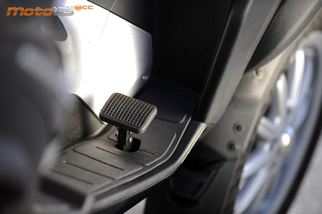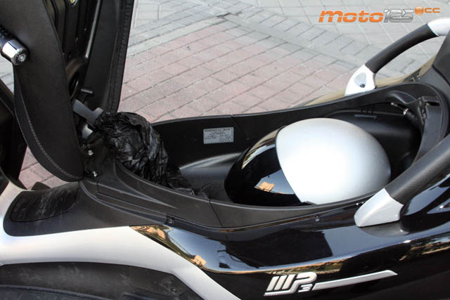El motor QUASAR de ‘dos y medio’ es mucho más dulce y suave que el Master de 400 cc, proporcionando unas prestaciones inferiores aunque suficientes para un uso preferentemente urbano, con salidas por carretera de unos 20~25 km de radio. | Otra diferencia del LT respecto al MP3 “moto” la encontramos en el pedal de freno. No es por motivos legales, sino una concesión que hace Piaggio a los usuarios de coche. Actúa como un freno combinado accionando los tres discos a la vez. Para los que nos gustan las manetas, siguen en su sitio las dos. | Hay espacio para dos cascos integrales y algo más. Junto a la bisagra encontramos el chubasquero que cubre el asiento cuando aparquemos el MP3 los días de lluvia. Al casco trasero se accede por una trampilla que se abre desde el contacto. El asiento incluye un sensor que detecta si está el conductor sentado (si no, no inicia la marcha). |