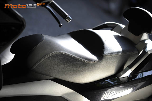 El MP3 es lo suficientemente grande para acoger sin apreturas a dos personas, pero sobre todo con un motor de 250 cc, no hay problemas para acelerar a ritmo normal con tripulación “de peso”, como sí ocurre en la versión de 125 cc, dirigida prácticamente a los usuarios de 16/17 años con el carnet A1. Es fácil subirse al asiento trasero, y con el “Roll Lock” activado, el conductor no hará falta sujetar firmemente el vehículo para soportar el peso del pasajero cuando se apoya en una de sus estriberas fijas. Se agradece el respaldo acolchado (no incluído en las primeras series) y las asideras laterales.