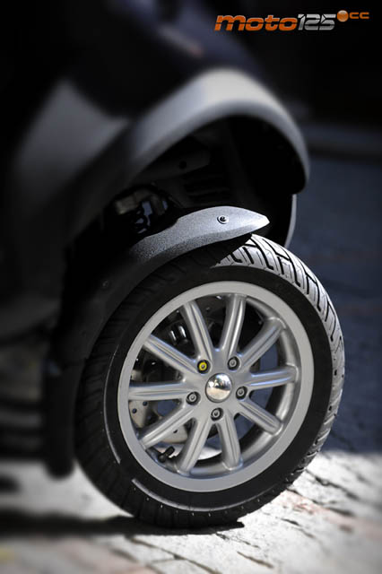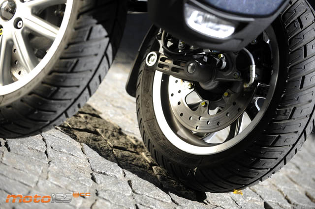 Transmite una muy buena sensación de seguridad, como hemos apuntado, que se ve incrementada al hacer uso de los frenos: podrías hacer el salvaje con el delantero, que la dirección seguiría el trazado que le hayas marcado. Casi como un ABS, pero sin ABS. Como hay doble superficie de contacto de las ruedas delanteras con el suelo, el agarre también se duplica, y eso se nota en cualquier viraje que hagas con el MP3. Si a esto le añades que cada rueda tiene su freno de disco, significa que, encima, aumenta la potencia de frenado sobre las motos convencionales, lo que hace que en tu cabeza ronde un sentimiento constante de confianza realmente buena, sobre todo para el que siempre ha andado un poco temeroso de las reacciones de las motos en las inclinaciones.