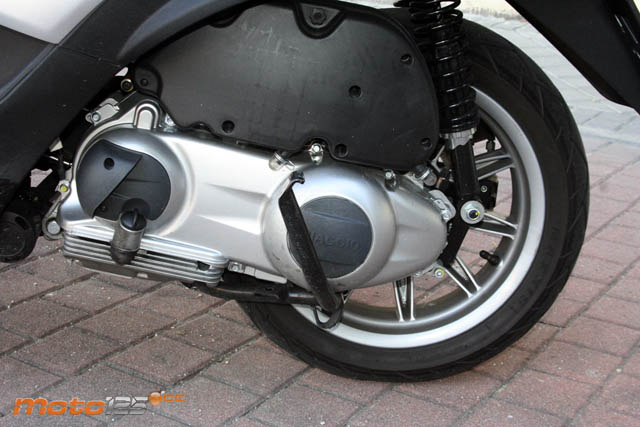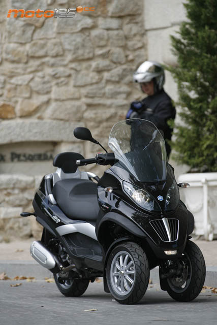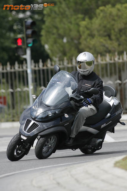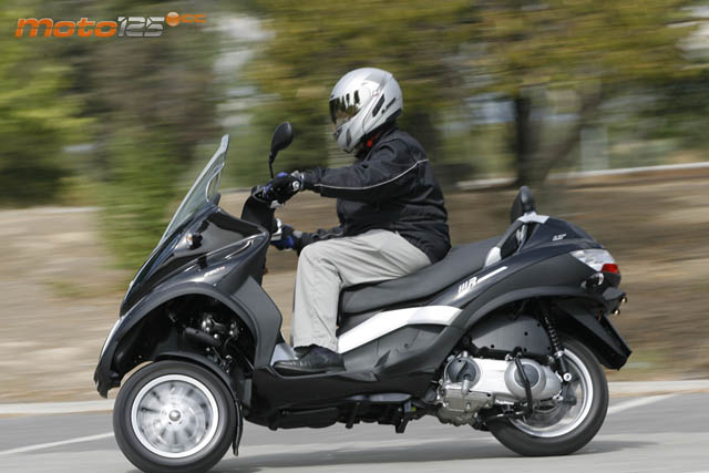 No pienses que por el hecho de contar con tres ruedas, el MP3 se conduce como un quad. El hecho de que lo veas estable en parado y que no haga falta utilizar el caballete central (que lo tiene) es porque dispone de un “Roll Lock” en la piña derecha que bloquea el paralelogramo deformable del tren delantero. En marcha se desbloquea automáticamente –si lo habías activado- y se comporta igual que una moto, inclinándose para trazar las curvas hasta un ángulo de 40º respecto a la vertical. Y a partir de aquí, empiezan las ventajas, ya que, la estructura delantera te impedirá que sigas inclinando (el riesgo de volcar es otra cosa si conduces haciendo el bruto) y, tal vez por el doble efecto giroscópico, es mucho más estable que un scooter convencional. Maniobrando en parado es más pesado y torpón (ojo con inclinarlo en parado, porque te costará devolverlo a su posición vertical), e incluso “culebreando” entre coches es menos ágil que una moto de dos ruedas, sobre todo ahora que se ha ensanchado la vía delantera. Pero en carretera va sobre raíles y apenas se mueve, lo que envuelve de una firmeza notable al piloto. Respecto a la versión de 400 cc, la de 250 cc es algo menos brillante en prestaciones. Basta comparar sus velocidades máximas efectivas: 144,9 km/h frente a los 128,5 que desarrolla este “dos y medio”. Pero, en cualquier caso, el tacto del motor Quassar resulta más dulce y menos brusco, y el vehículo es más ligero y ágil para emplear a diario en horas punta. Cuestión monetaria aparte, el 250 resulta mucho más aconsejable cuando vives a unos 20~25 km del núcleo urbano donde se encuentra tu centro de trabajo.