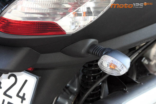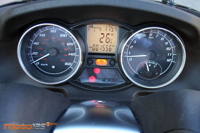 El cuadro es de lo más completo que puedes encontrar en un scooter: relojes cuentavueltas (con el nivel de gasolina) y velocímetro, multitud de testigos luminosos y una pantalla digital multifunción sobrada de información que se controla con el botón de Mode en la piña derecha. | El tren delantero es un paralelogramo deformable con brazos de aluminio que se comporta como un scooter tradicional. No se cierra por la parte inferior para permitir que cada eje de rueda disponga de suspensión independiente. Las ruedas de 12 pulgadas cuentan con sus respectivos discos de 240 mm. | Los intermitentes están separados de la carrocería para cumplir con la separación mínima exigida por ley. Lo curioso es que se mantienen los intermitentes originales integrados en la carrocería, incluidas las bombillas, aunque no están conectadas. |
