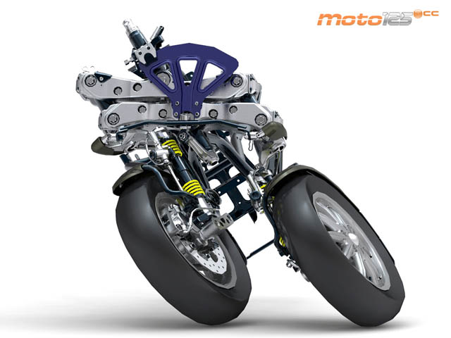 Sin duda el detalle más importante del MP3 se encuentra en su tren delantero de dos ruedas. Cada una cuenta con un monobrazo por bieletas con sus suspensión independiente (como la de las Vespa), haciendo estos dos monobrazos con lados verticales (cuando el MP3 está en posición vertical) de un paralelogramo deformable (se pueden ver en la figura los otros dos lados horizontales). El sistema cuenta con bloqueo de esta “deformabilidad” denominado “Roll Lock” (de serie en todos los MP3 actaules, antes no); se puede localizar en la figura por la pieza morada, en forma de arco, “mordido” por una especie de pinza.