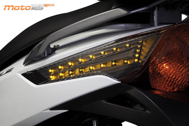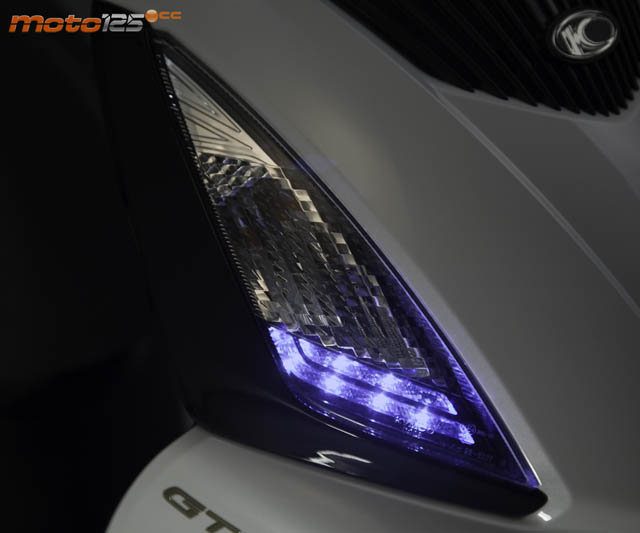La originalidad en la iluminación de Kymco en sus últimas creaciones se sigue manteniendo en el People GTi; de hecho, en esos desmesurados intermitentes triangulares delanteros, se integra la luz de posición, en su parte inferior, por medio de dos filas de diodos LED blancos con cierto tono azulado, que recuerda el alumbrado xenon. Detrás, los intermitentes siguen las tendencias Audi, marcando su contorno, esta vez con 23 diodos LED de color ámbar. Y aunque el piloto posterior emplea una bombilla incandescente tradicional, su tulipa de gran superficie se ocupa de darle originalidad, repartiendo su luz como si se tratara de una matriz de múltiples puntos luminosos. Sin duda, marca estilo desde el ángulo posterior.
