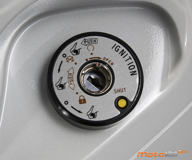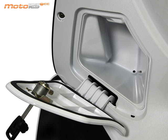 Kymco no se ha esforzado mucho en buscar la forma de aumentar la capacidad de carga en un “rueda alta”. El hueco da sólo para cosas pequeñas, como un notebook o un móvil, que se podrá recargar con la toma de corriente que incorpora. | La cerradura de contacto del People tiene más funciones que una navaja suiza. Además de lo habitual, se puede abrir el asiento (con o sin el motor en marcha e incluso con el bloqueo puesto) y dispone de un obturador con apertura magnética codificada para que nadie ande hurgando. | Un detalle que se está perdiendo en los “rueda alta” es la guantera en el salvapiernas. El People GTi sigue siendo fiel a este detalle, aunque lo reduce a la mínima expresión en cuanto a capacidad se refiere. Eso sí, el contenido está protegido por una cerradura, como debe ser. |