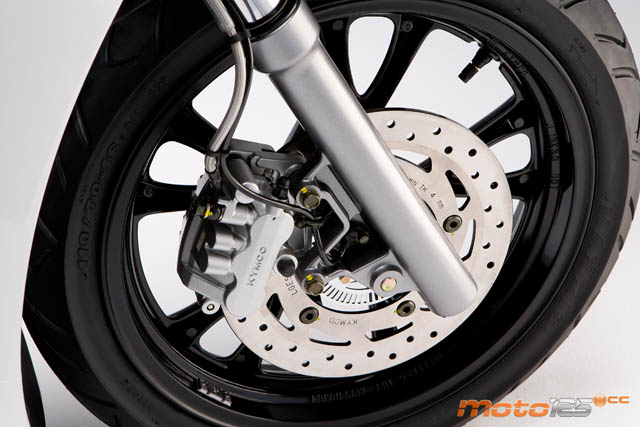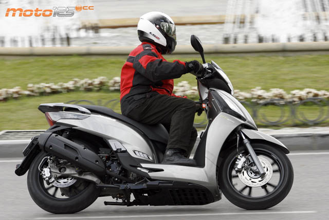 Por suspensiones, sigue mostrando, como muchos Kymco de 125 cc, un tacto seco en recuperaciones que te hace botar al pasar cualquier badén. Afortunadamente, el tarado de muelle parece el adecuado en la posición más blanda de precarga.
