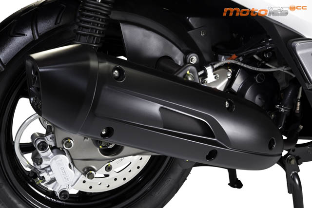 En Kymco cuidan la buena iluminación y juegan con muy buen gusto con el diseño. Los LEDs de los intermitentes traseros forman el contorno siguiendo las tendencias marcadas por Audi en los coches. El piloto trasero reparte la luz de una bombilla en una matriz de numerosos puntos luminosos. | Y en la parte delantera se recurre a los LEDs para formar una doble línea debajo de los intermitentes (también inspiración Audi). Tienen un tono azul que nos recuerda a las luces de xenon. Como están separados del faro (una sola óptica en el manillar), se hacen ver muy bien. | En el tren posterior encontramos un freno de disco con las mismas dimensiones que el delantero (260 mm), aunque en este caso “mordido” por una pinza convencional de doble pistón. El escape es menos voluminoso de lo que aparenta su protección anticalórica. |