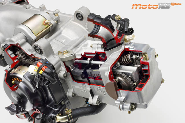 Por otro lado, hablar de “cuerpo grande” es sinónimo de “lastre”, sobre todo cuando se trata de impulsarlo con 125 modestos centímetros cúbicos. Pero Kymco lo hizo muy bien con el motor del SuperDink 125i y lo repite en este People GTi: vuelve a emplear el mismo grupo termodinámico y las diferencias sólo afectan a unos cárteres más alargados para acoger la rueda de 16 (correa más larga y mismas poleas) y al desarrollo final de la reductora. Por ello, se mantienen los mismos “gadgets”: el cilindro desplazado (offset cylinder) para que la biela se sitúe perpendicularmente a la cabeza del pistón cuando se produce el momento de mayor fuerza en la explosión (los rozamientos de los segmentos con la camisa son casi nulos), cilindro de aleación de magnesio con recubrimiento de Nickasil (mínimo consumo de aceite con cambios cada 5.000 km), pistón aligerado de falda corta, culata de cuatro válvulas con rodamientos de agujas en los balancines e inyección electrónica firmada por Synerject. Todo ha sido pensado para minimizar pérdidas por rozamientos e inercias, aprovechando al máximo la gasolina que consume.