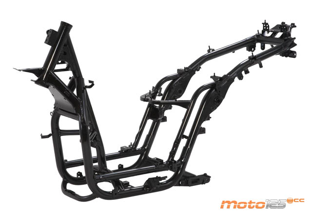 El detallazo del People GTi no se ve, pero se nota, porque, si se le desnuda de sus plásticos, en realidad esconde una estructura de tubos súper reforzada. Para que te hagas una idea, lo que suele ser un simple tubo que une la pipa de la dirección con la estructura del suelo, son ahora ¡tres! tubos de diámetro 38,1 mm (las barras de horquilla son de 37 mm) con refuerzo por cartelas en la pipa. Y, por si todo esto te parecía poco, el suelo lo forman dos dobles cuna cruzados con tubería del mismo diámetro anterior y con tres refuerzos transversales. En una palabra: indestructible.