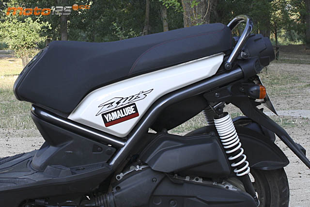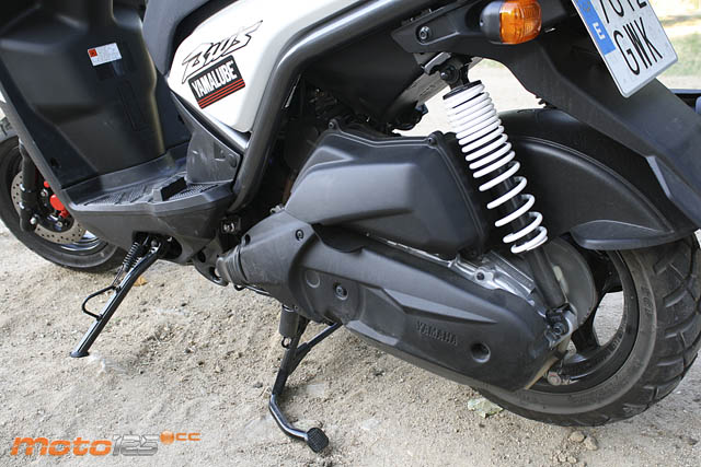 De su fabricación se ocupa Yamaha Motor Taiwan, la misma filial que produce el Cygnus para Europa, modelo con el que comparte la misma mecánica: toda una garantía de fiabilidad y buen funcionamiento. La versión original taiwanesa está equipada a tope, muy sofisticada; merece la pena echarle un vistazo. El nuevo BW’s 125 no se parece nada al original, de aspecto más gordote. Es un ejercicio de estilo radicalmente diferente: más estilizado y formas más modernas, con chasis tubular que se hace ver entre los plásticos y equipado con hueco para un casco integral bajo el asiento, como debería haber sido en su segunda renovación BW’s NG. Pero es que tampoco son demasiado Big Wheels sus neumáticos. Son de diámetro 12, como tienen que ser como mínimo actualmente, y en perfil bajo con medidas 120/70-12 en ambas ruedas. Tamaño muy común entre los scooters urbanos e incluso en algunos la hemos visto ligeramente más ancha en el tren posterior (130/70-12). En el original, se conservaba esa sección de 120 mm, pero el balón era más redondo (90% en lugar de 70%, la segunda cifra de la medida), y se acentuaba ese efecto de “rueda gorda” bajando el diámetro de las llantas hasta las 10 pulgadas. Está claro que la BW’s 125 ha perdido espectacularidad. Eso sí, para ser fiel a la filosofía offroad, el tallado de las gomas permite alguna escapadita en mejores condiciones que con unos neumáticos de asfalto puro. No son los “tacos” del BW’s de 50 cc, pero como, al final, una inmensa mayoría de sus usuarios lo va a emplear casi en un 100% de los casos sobre asfalto, pues mejor para su seguridad (no es nada recomendable un neumáticos de tacos sobre asfalto). Ocurre como con los coches, que a mucha gente les encanta conducir un todo terreno o todo camino, pero la mayoría no van a pisar un camino en su vida. Con esa misma mentalidad se ha hecho el BW’s 125, porque, en realidad, se trata de un scooter urbano, muy robusto mecánicamente y que, por tanto, soporta muy bien ese mal trato que se le va a dar a un vehículo de uso diario.