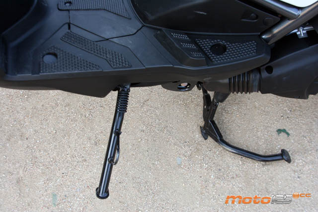 El motor es el mismo del Cygnus: con refrigeración por aire forzado y alimentado por inyección electrónica. Se prescinde del pedal de arranque, que sí monta el Cygnus, y el variador está bien refrigerado por la canalización que se ve a la izquierda. | La pata de cabra es como debe ser: de las que no se recogen solas y cortan el encendido. La mejor garantía para aparcar de forma rápida tu scooter. En la imagen también se aprecia la zona de apoyo de los pies del pasajero. | El cuadro tiene la mínima información exigible a un scooter: velocímetro, totalizador, nivel de gasolina y tres testigos. Con el manillar desnudo, va montado en una caja anclada a su centro. |