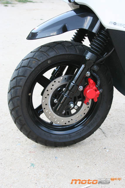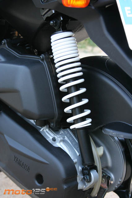 Se ha perdido la espectacularidad de las ruedas “gordas” del BW’s clásico. Eso sí, la imagen de scooter todo terreno se refuerza con el dibujo de los neumáticos, los fuelles en la horquilla y el guardabarros elevado. Detalle racing: la pinza pintada de rojo. | La doble óptica de faro superpuesta aporta espectacularidad en el frontal del BW’s. La óptica grande (abajo) es la principal con bombilla halógena. La de arriba y más pequeña corresponde a la luz de posición. | El comportamiento de la suspensión trasera es bastante seco. A la vista está que la calidad del amortiguador desentona del resto del scooter: un cuerpo demasiado estrecho (más propio de un 50 cc) y sin posibilidades de ajuste de precarga. |