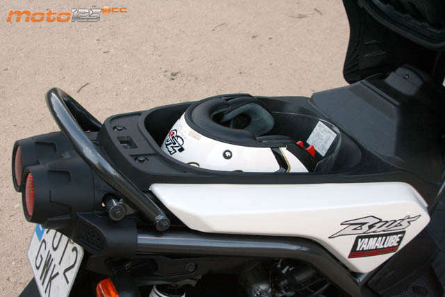 Eso sí, en cuanto a equipamiento, el BW’s viene “pelao”, debiendo confiar su capacidad de carga –fundamental en un urbano- al hueco del casco ya mencionado y a la plataforma para apoyar los pies, muy justita en superficie. No hay, pues, ni guantera ni portabultos. La protección del escudo es tirando a escasa, pero sí encontramos otros detalles útiles, como la cerradura de contacto con obturador, una asidera muy a mano para maniobrar el vehículo o para que se sujete el acompañante, el asiento que se abre solo gracias al muelle en su bisagra, y el tapón de gasolina con cerradura situado en el extremo delantero del asiento para no ensuciar el contenido del hueco del casco (aunque corre riesgo de mancharse el asiento y nuestros pantalones).