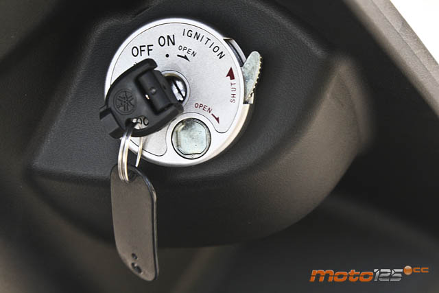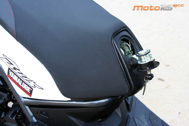 Por fin un hueco para un casco integral (aquí con un jet) debajo del asiento de un BW’s. A veces, para que entre deberás poner el hueco del cuello hacia arriba. El asiento se levanta solo, sin hidráulicos: un simple muelle concéntrico con la bisagra. | El tapón de gasolina, con cerradura, se encuentra en la parte delantera del asiento, sin riesgo de manchar el contenido del hueco del casco. Eso sí, lo que peligra es la tapicería y, con ella, los pantalones del conductor. | El BW’s se suma a la cerradura con obturador. Se activa con la palanquita de la derecha (Shut) y se abre con una llave hexagonal magnética adosada a la llave tradicional. El mango de la llave está articulado para que no te lo claves con la rodilla. |