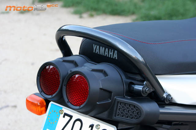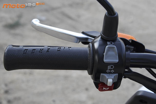 Destaca, por delante, la saltona doble óptica superpuesta. El faro inferior es el principal e incluye los dos haces principales iluminados por bombilla halógena. En su manillar desnudo encontramos unos mandos correctos y en su sitio, el detalle de un guardapolvo en la maneta del freno trasero y un cuadro de instrumentos reducido a la mínima expresión de información: velocímetro, totalizador y testigos.