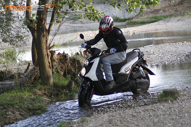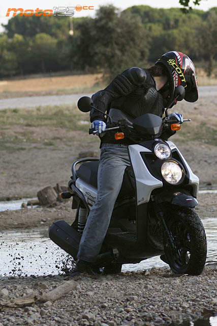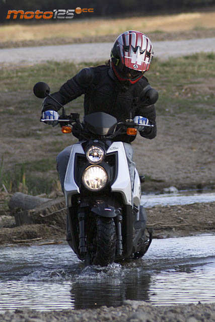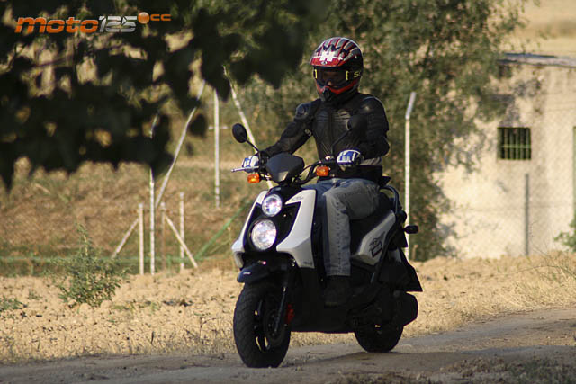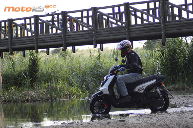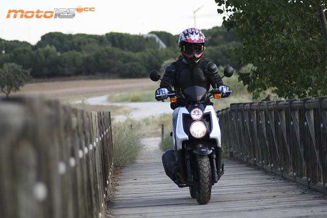 Donde sí que empieza a mostrar debilidad, es en carretera abierta, quedándose por debajo de los 100 km/h. Se ve que el desarrollo final se ha hecho un poco más corto en beneficio de unas aceleraciones y recuperaciones más briosas. Y también pensando en ese uso offroad del que hace imagen, no nos olvidemos. Por cierto, en este terreno: prudencia. No es una enduro y el simple hecho de no poder apoyar las rodillas en un depósito, no permiten un control total. Está bien elevada del suelo para no golpear los bajos ni contra los bordillos en la ciudad ni contra las piedras en campo. Cuidado, eso sí, con los bajos del motor, y aunque el mismo caballete central hace de protector de los cárteres, no es lo suyo. Eso sí, aguanta mejor el trote para caminos forestales y firmes en mal estado que otros scooters.