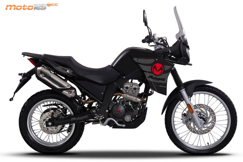 El segundo modelo que a partir de ahora tiene en exclusiva Malaguti es esta trail con estética africana (guarda cierta similitud con las grandes BMW GS) basada en la también desaparecida Derbi Terra Adventure, y que, por sus grandes dimensiones va a pasar como una moto que aparenta mucha más cilindrada.