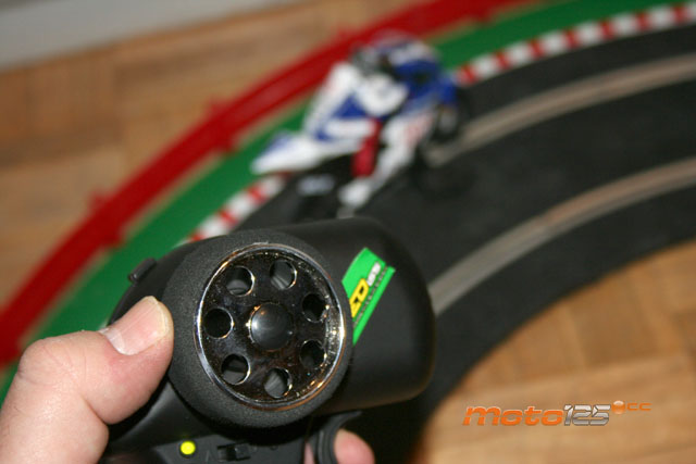 Lógicamente, el mando no tiene nada que ver con el tradicional basado en el potenciómetro, ya que requiere dos controles: un gatillo para la velocidad y una rueda para la inclinación. Para utilizarlo, se requiere un adaptador -incluido en el kit- en diferentes versiones según la pista que vayas a emplear es de Scalextric, SCX, Carrera, Ninco o Superslot. Su manejo requiere un poco de práctica, al principio con las dos manos, pero con la práctica serás capaz de hacerlo con una sola: está bien pensado. Además, el mando incluye un par de LEDs que indican el buen funcionamiento del sistema, un “trimmer” para ajustar la velocidad de la moto a un valor fijo y poder echar carreras en solitario con otra, y un conmutador para pasar a control analógico y poder manejar un coche convencional sin cambiar cables. |