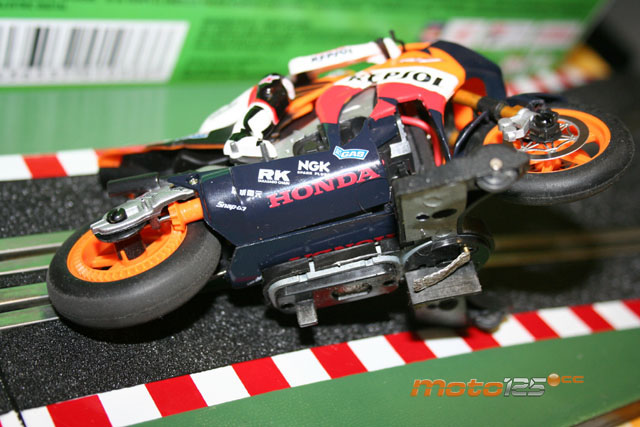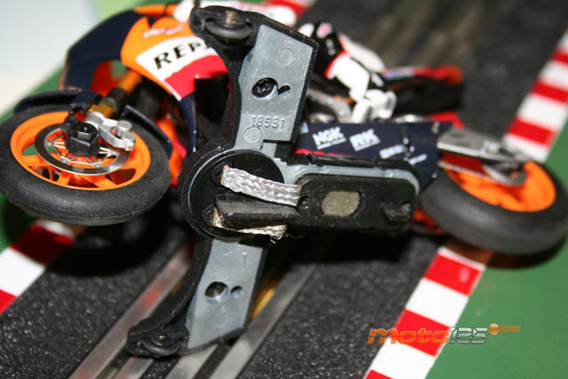 El mando ISS requiere un poco de práctica porque hay que tener en cuenta tanto la velocidad como la inclinación de la moto. Auténtico pilotaje fiel a escala. Al final le coges el truquillo, incluso con una sola mano, manejando con el pulgar la inclinación y con el dedo índice la velocidad. | Bajo la quilla del carenado encontramos el patín basado en una estructura metálica para dar aplomo al conjunto. Se puede ver en los extremos laterales las pequeñas ruedas, la guía móvil delantera con las trencillas típicas que hacen el contacto con los carriles, la guía fija trasera y, entre ellas, el imán regulable que lo “pega” más a la pista. |